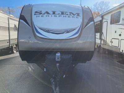 Get started today on your next camping trip in this Salem Hemisphere Hyper-Lyte travel trailer that will comfortably sleep two. You'll sleep well in the private bedroom that includes an queen bed with Versa-Tilt and two wardrobes for your things. Enjoy your meals seated at the theater seating with cup holders and a removable table for breakfast time. The kitchen has everything you need to prepare a meal; a three-burner range, a microwave, and plenty of counter space to prep meals. Once you've spent your day at the lake or hiking through the woods, come back to this trailer and clean up in the full rear bath before heading back outside to enjoy sitting under the awning!