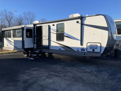 Sleeps 5 Slides 3 Length 37 ft 11 in Ext Width 8 ft Ext Height 11 ft 2 in Hitch Weight 1405 lbs Dry Weight 9688 lbs Cargo Capacity 1917 lbs Fresh Water Capacity 57 gals Grey Water Capacity 90 gals Black Water Capacity 30 gals Available Beds Custom King Refrigerator Type 12V Refrigerator Size 10 cu ft Cooktop Burners 3 Number of Awnings 2 Water Heater Type On Demand Tankless AC BTU 31500 btu TV Info LR 50" LED Smart TV Awning Info 12' and 14' with LED Lights Axle Count 2 Washer/Dryer Available Yes Shower Type Walk-In Shower Electrical Service 50 amp Similar Travel Trailer Floorplans