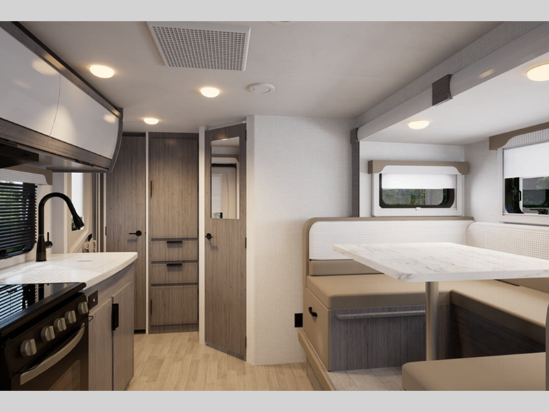 Each model is constructed with thermopane Euro windows, a molded fiberglass front cap, and Azdel interior panel walls for durability. There is Lite-Ply cabinet construction inside, along with Surf-X suedo solid surface lightweight countertops and tables, decorative backsplash, and many more interior comforts. Outside, the Keyed-Alike storage compartment doors will keep your gear secure and the exterior wash station will make it easy to wash off camp gear.
