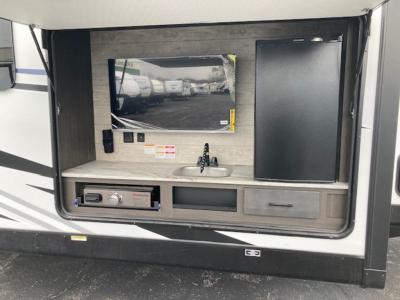 Come see all that this travel trailer has to offer! Relax in true comfort in the front living area with a 70" tri-fold sofa with end tables on either side or in the theater seating across from the entertainment center with a TV and 30" frameless fireplace. The kitchen island will make your meal prepping easier and you can enjoy them at the table and chairs then play a card game or two. You could even cook your meals at the exterior campfire café with a refrigerator, a sink with countertop space, and a griddle. The full bathroom has a 30" x 36" shower for you to freshen up in each morning. Enjoy a good night's rest each night on the 70" x 80" sleep tight king bed slide across from a dresser with a 30" frameless fireplace in the rear private bedroom, plus there is a wardrobe with washer and dryer prep and one of the dual entry doors with triple pull-out aluminum steps!